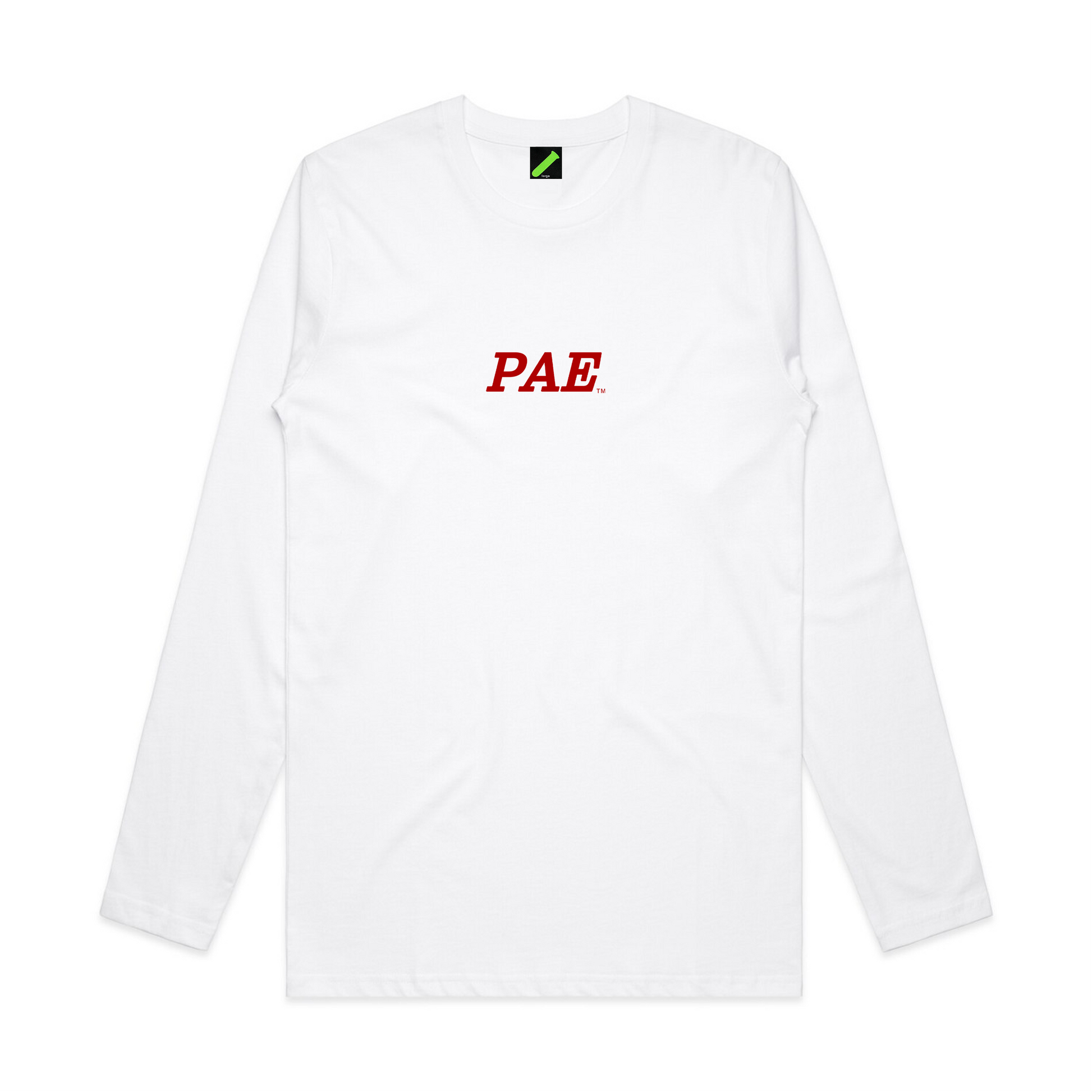 Navy blue/dark red logo, screen printed on white cuffless long sleeve