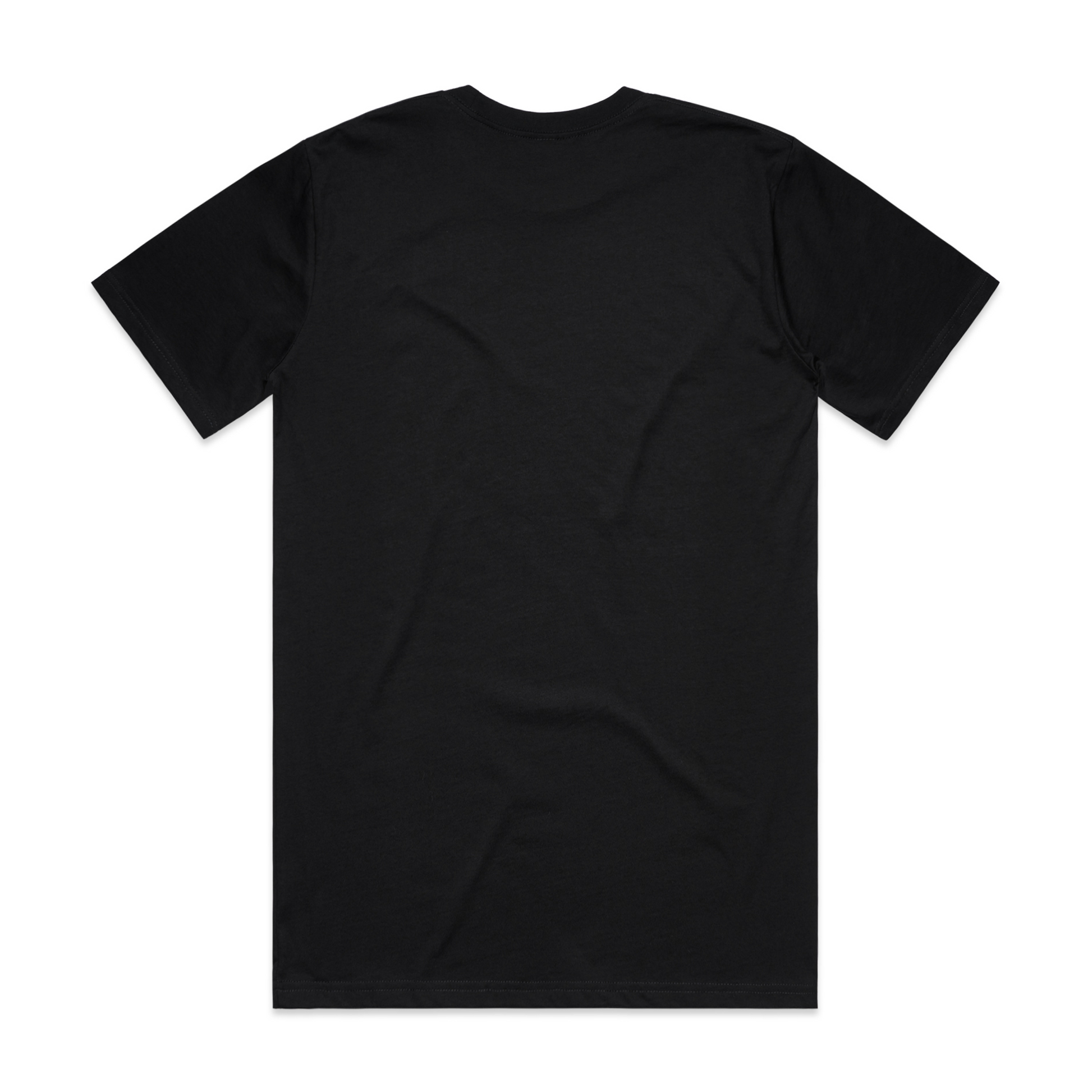 Black shirt with white design screen printed front and blank on back with screen printed label.